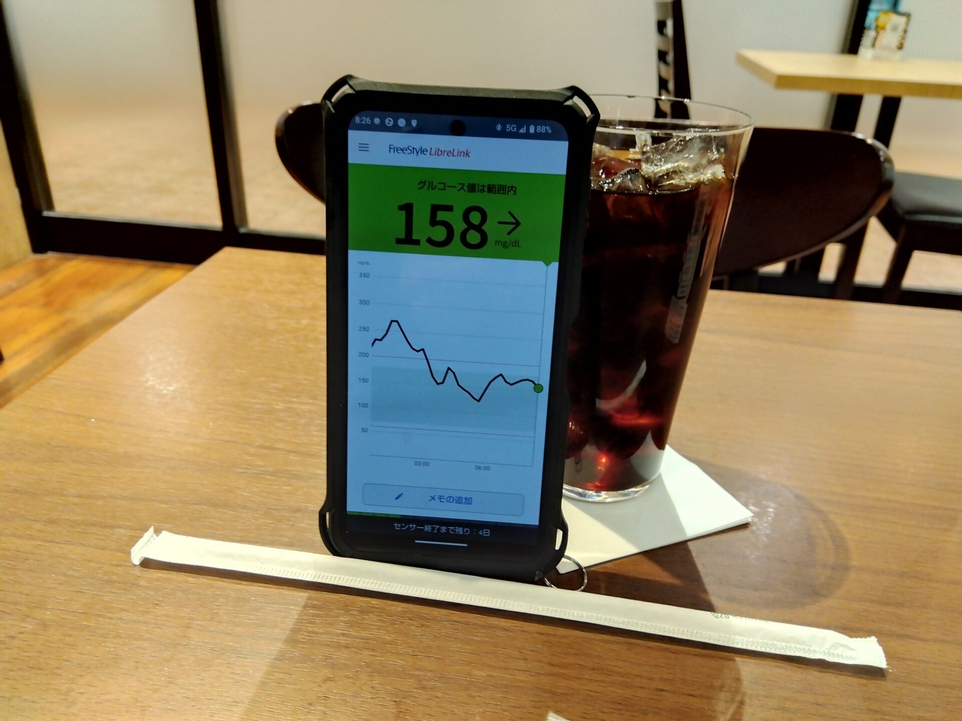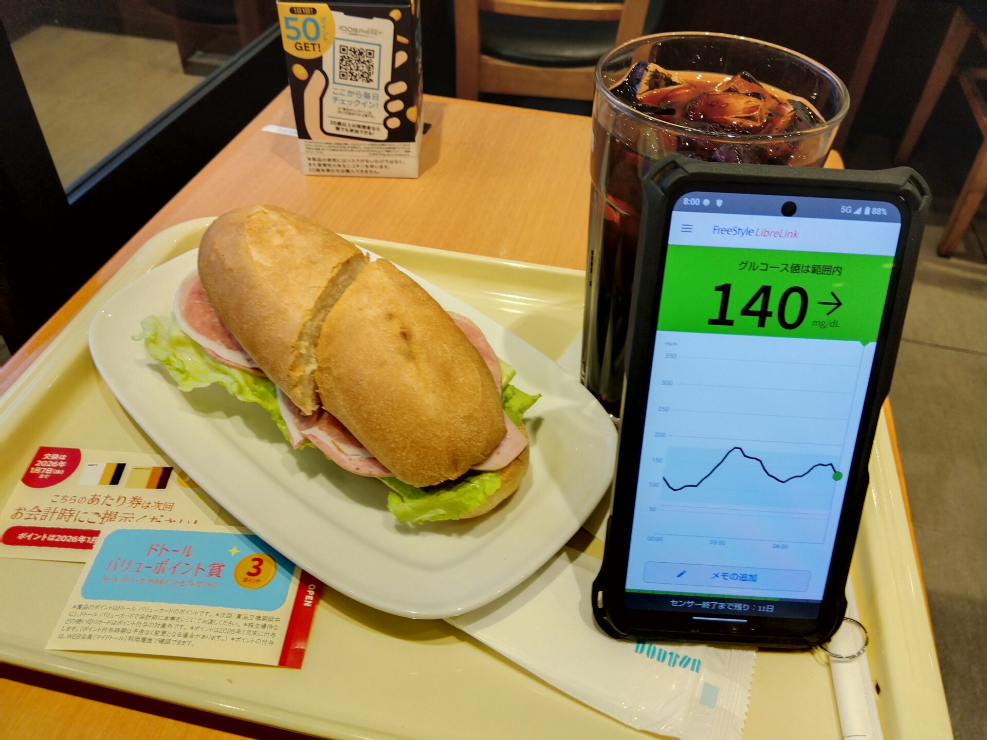 朝イチ血糖値が204mg/dLと高かったから 何も食べずにアピドラ5単位打っておいたんだけど 、勤務開始から2時間後 ドリンクもそこそこ飲んでいるからトイレにも行きたくなって ついでに血糖値も測ってみたら・・・