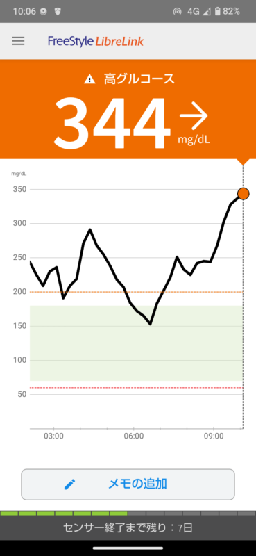 そして今の血糖値は344mg/dLまで上昇!