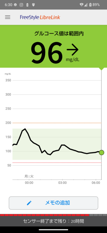 寝起きからカフェ到着まで約2時間 だいたい30mg/dL上昇したってことになる。